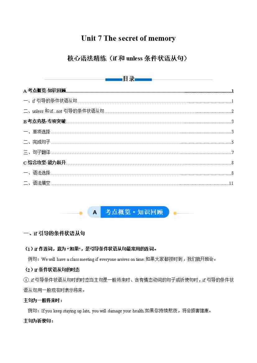 八上沪教.Unit 7 The secret of memory条件状语从句(单元核心语法精练)(原卷版)
