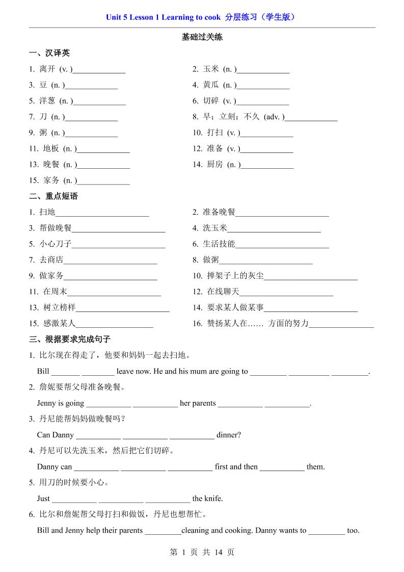 Unit 5 Lesson 1 Learning to cook(分层练习)