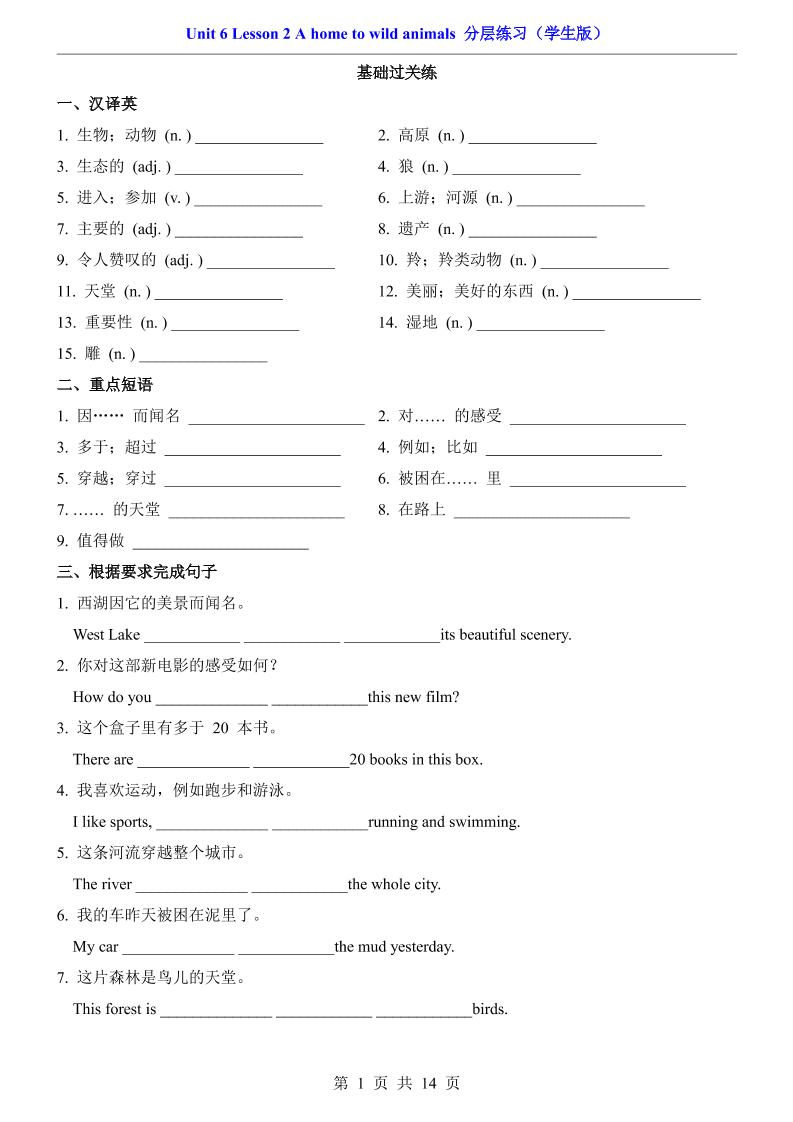 Unit 6 Lesson 2 A home to wild animals(分层练习)