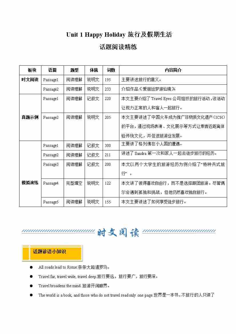 Unit 1 Happy Holiday人与社会:旅行及假期生活(话题阅读精练)(原卷版)
