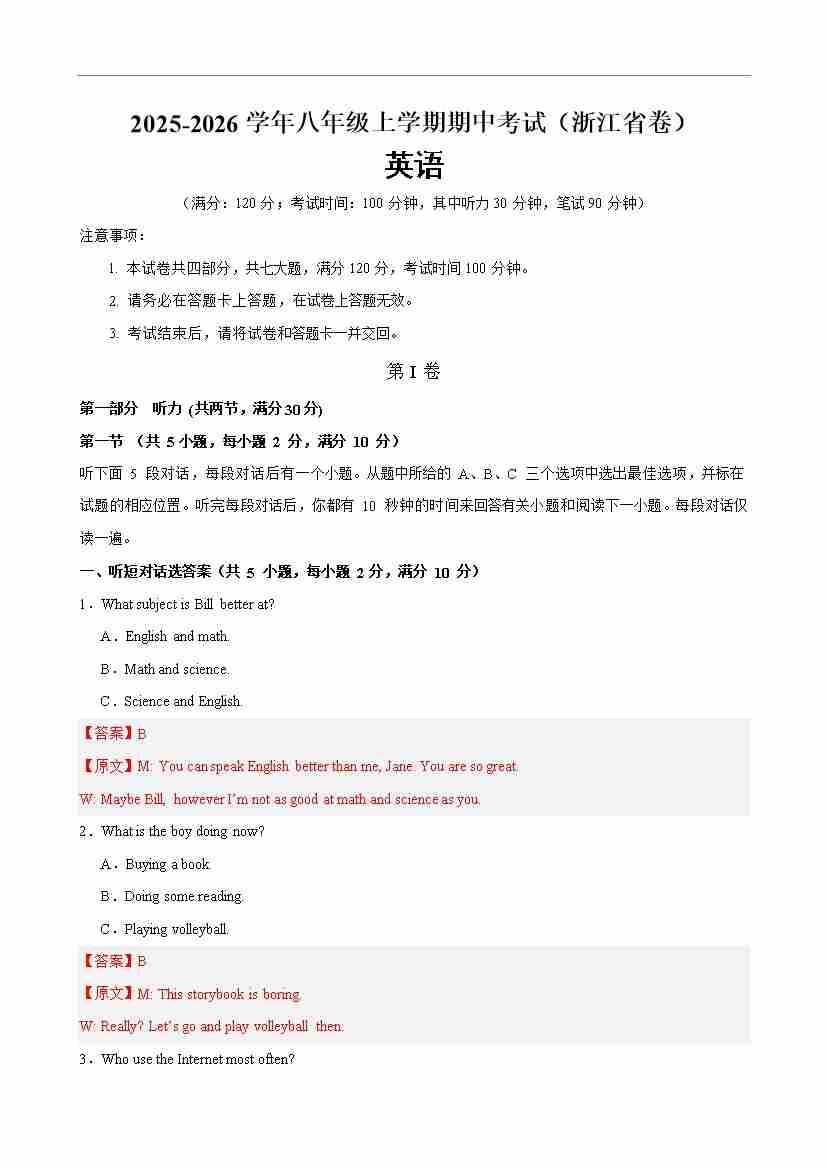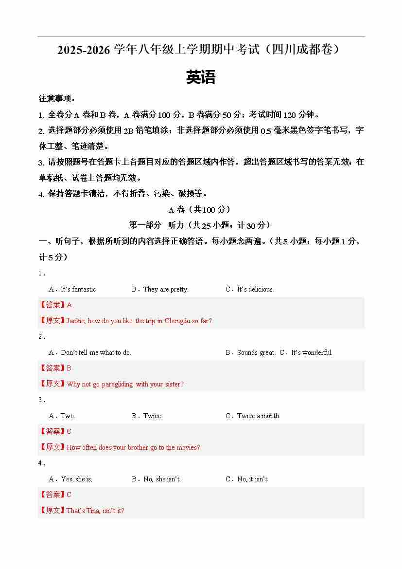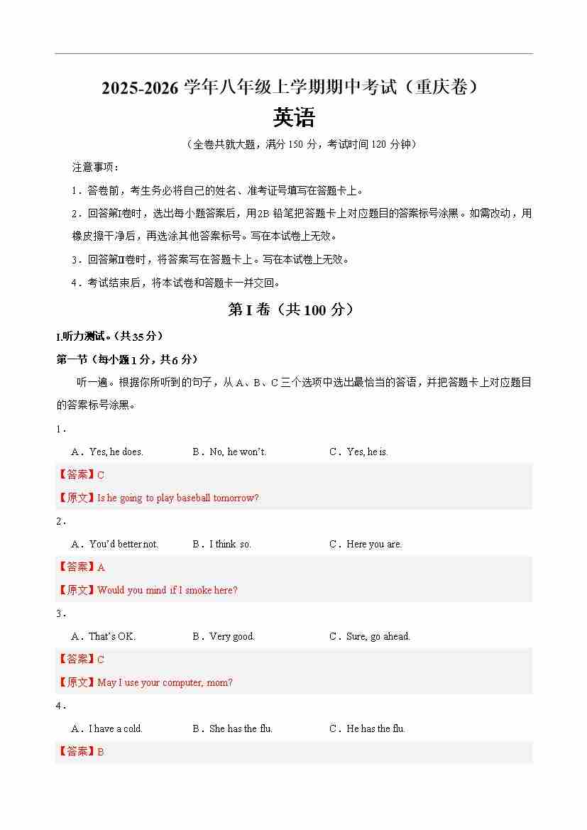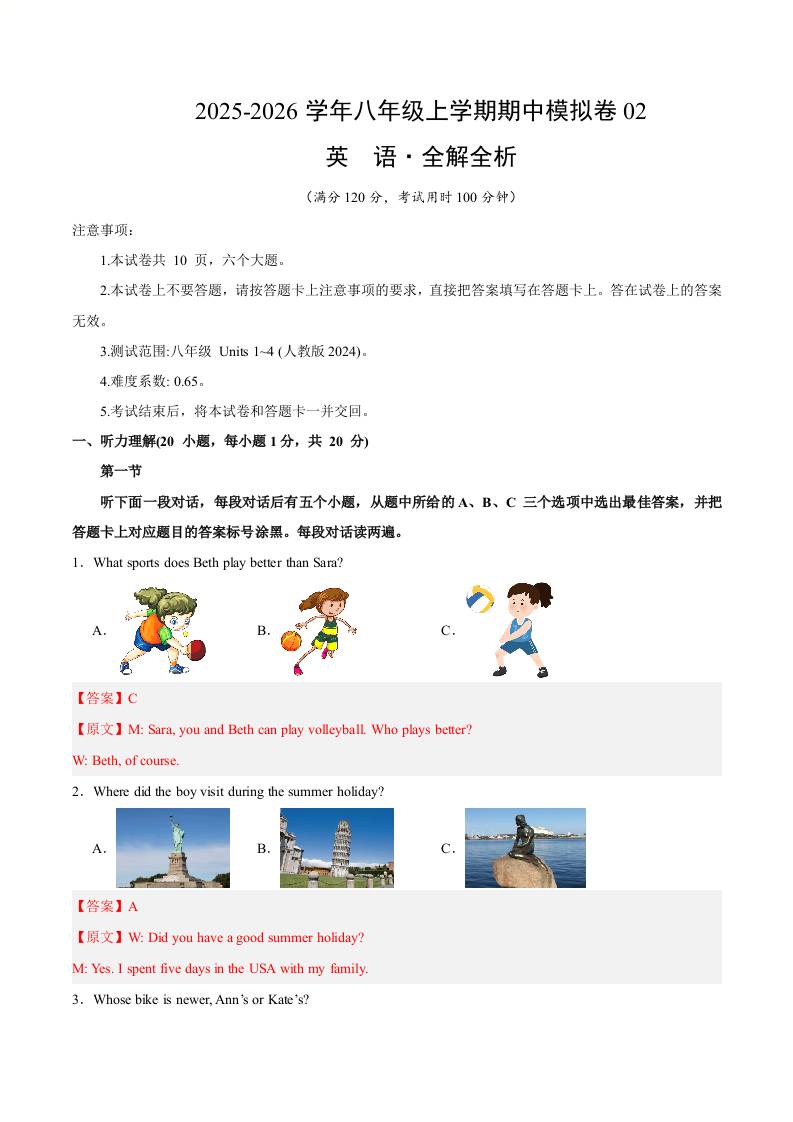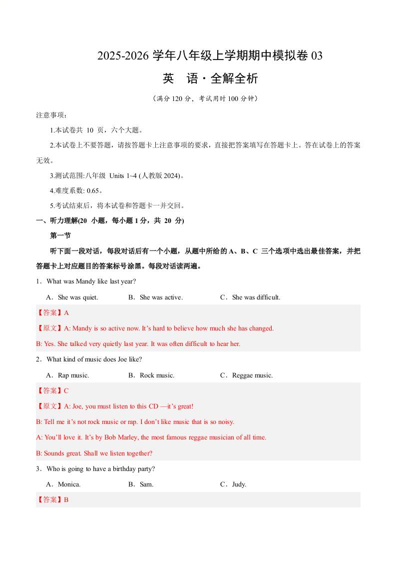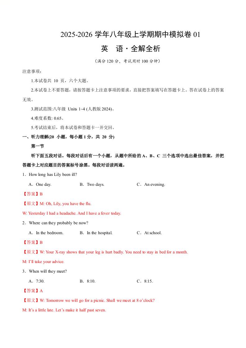八年级英语上学期期中模拟卷(人教版专用)(解析版)