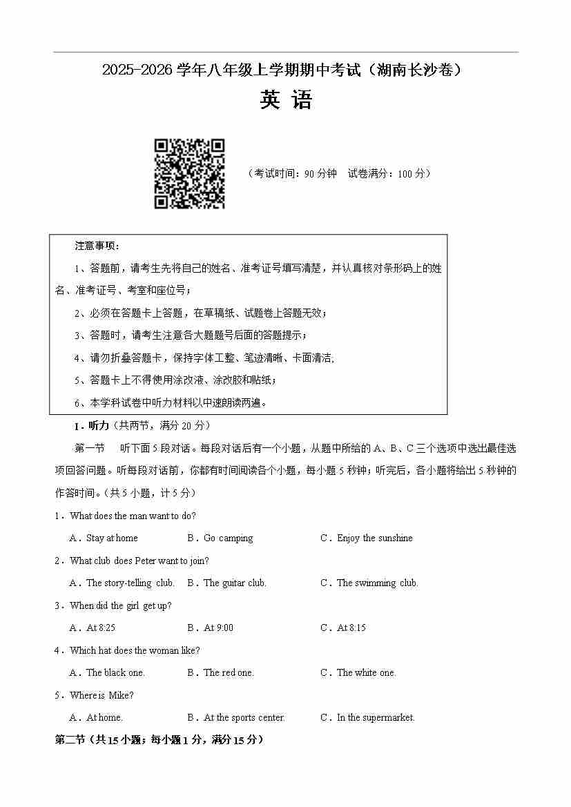 八年级上学期期中考试(湖南长沙卷) (原卷版)