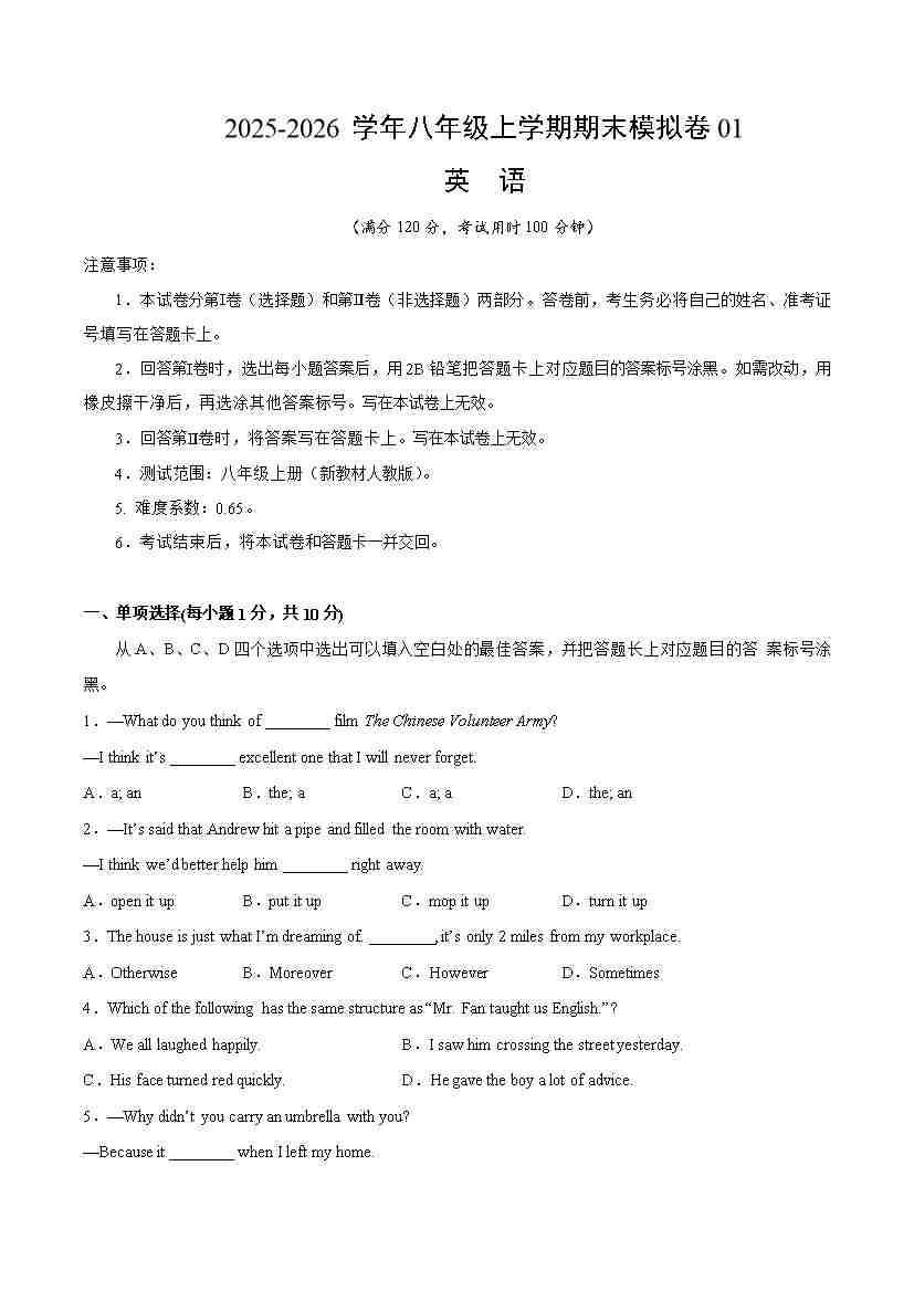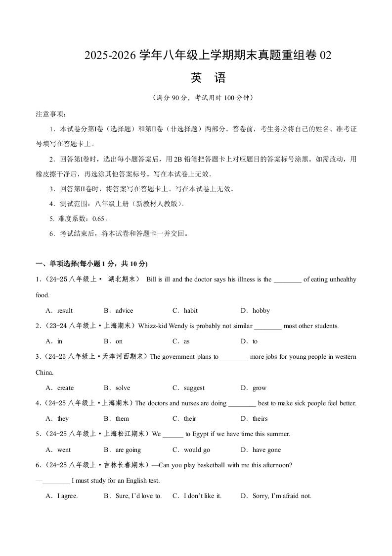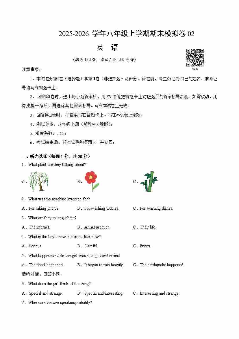 八年级英语上学期期末真题重组卷02(新教材人教版)(考试版A4)1
