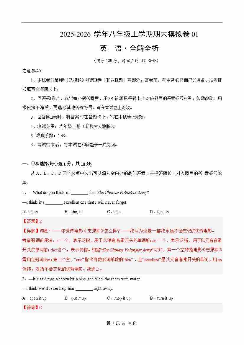 八年级英语上学期期末模拟卷01(新教材人教版)(解析版)