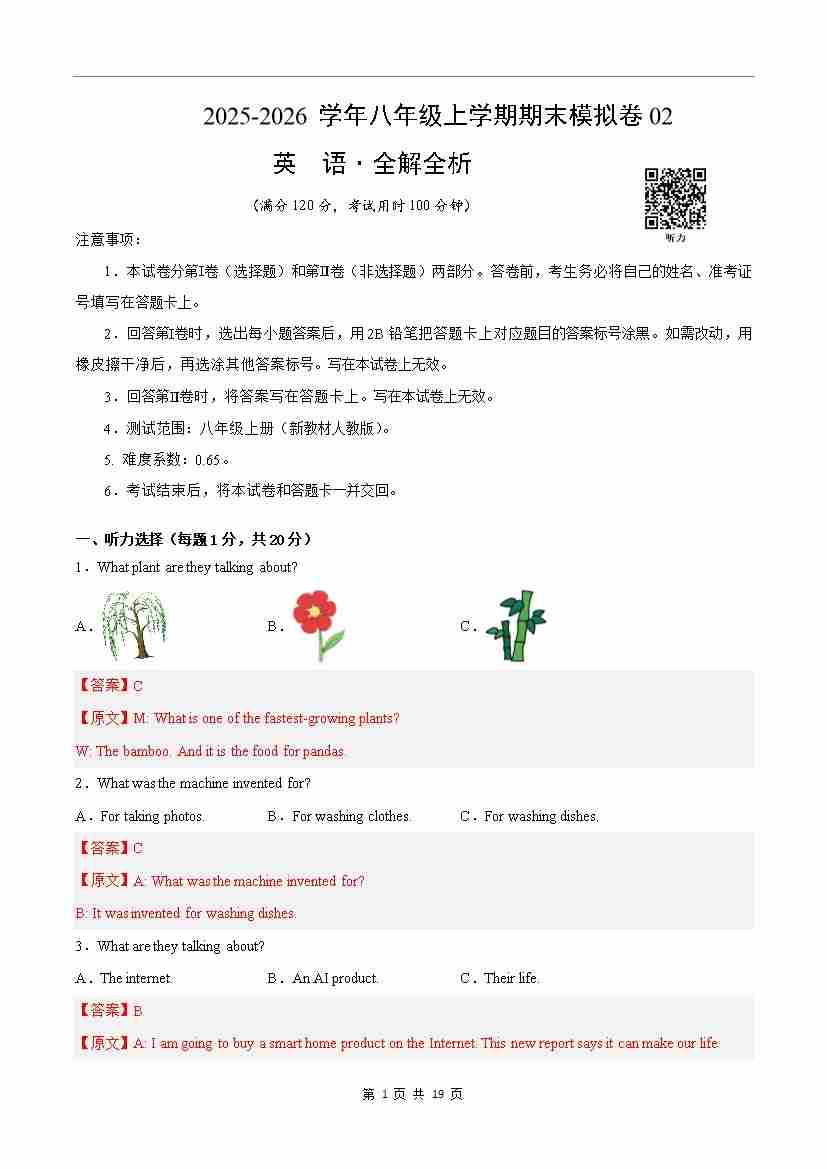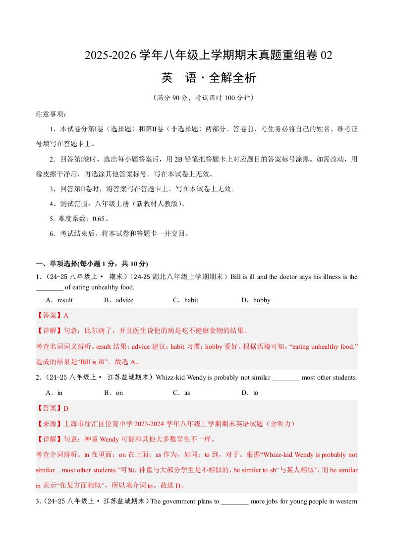 八年级英语上学期期末真题重组卷02(新教材人教版)(解析版)1