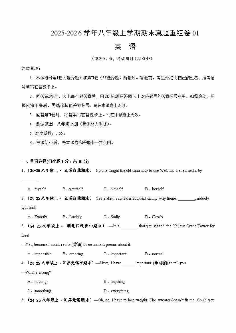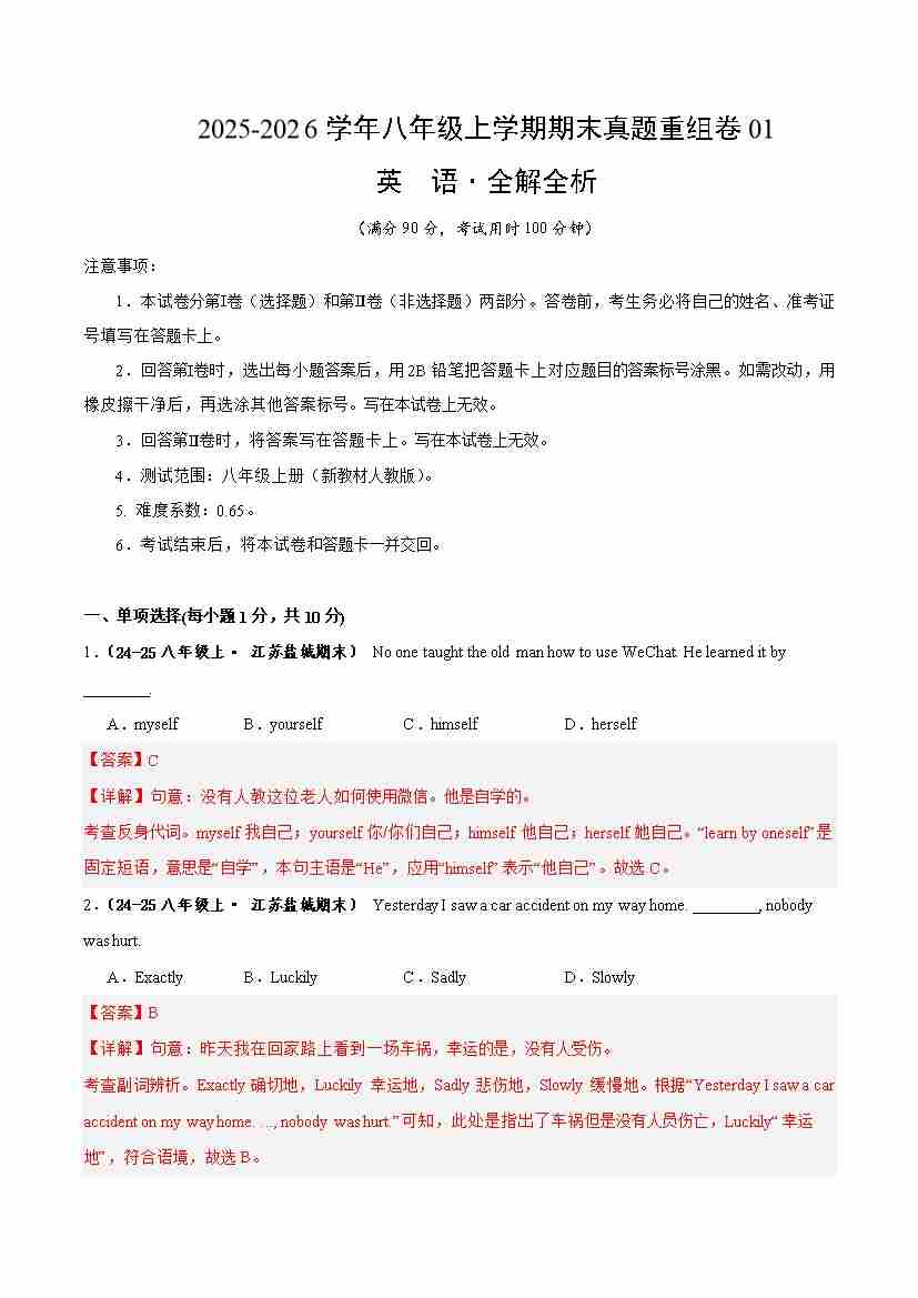 八年级英语上学期期末真题重组卷01(新教材人教版)(解析版)