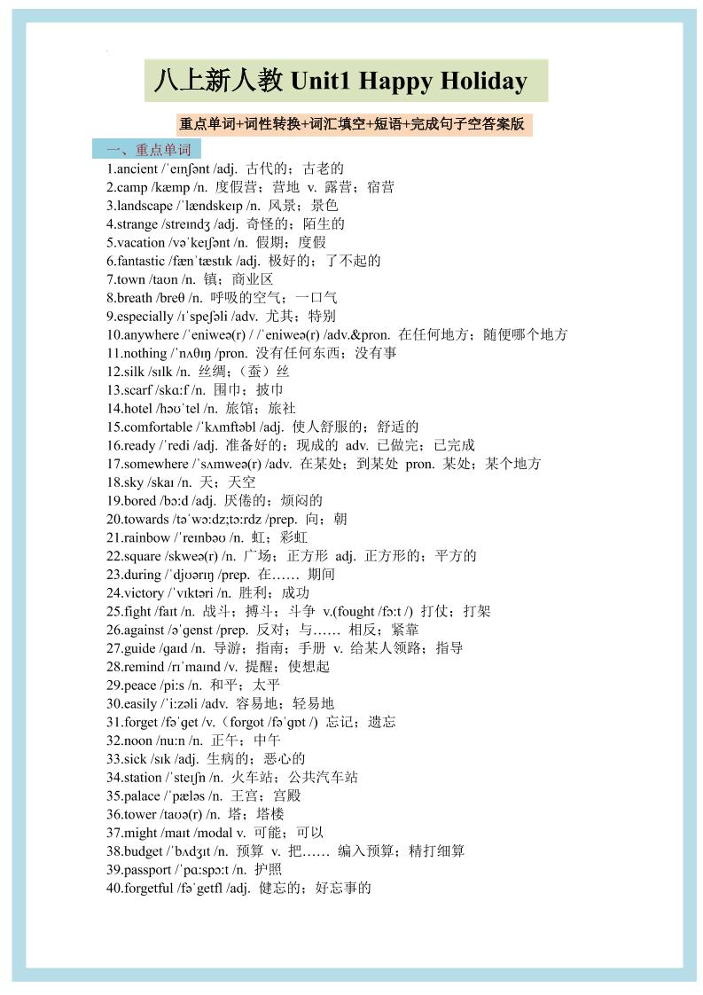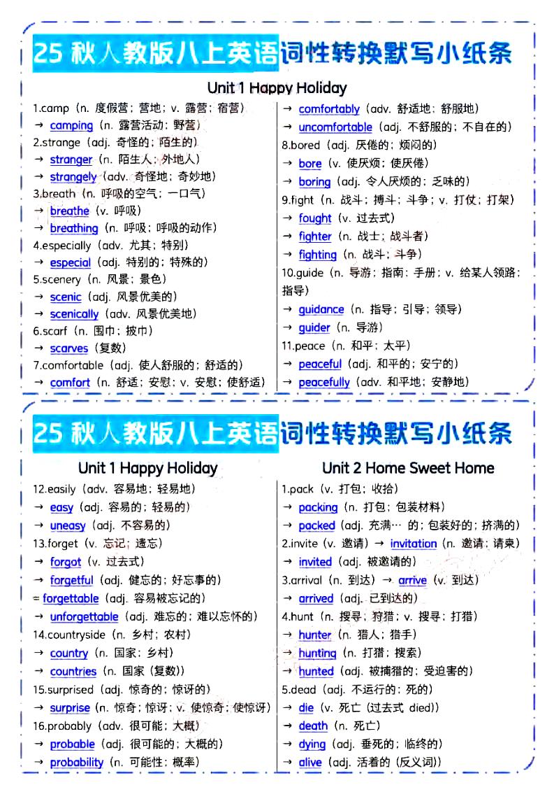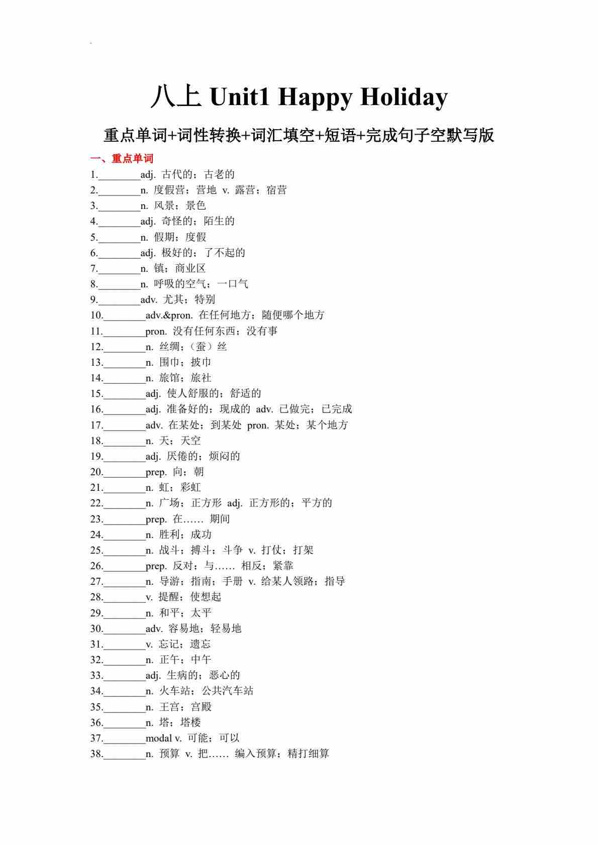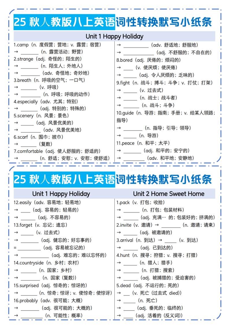八上Unit1-Unit8 重点单词_词性转换_练习题_短语_完成句子_背记版(1)