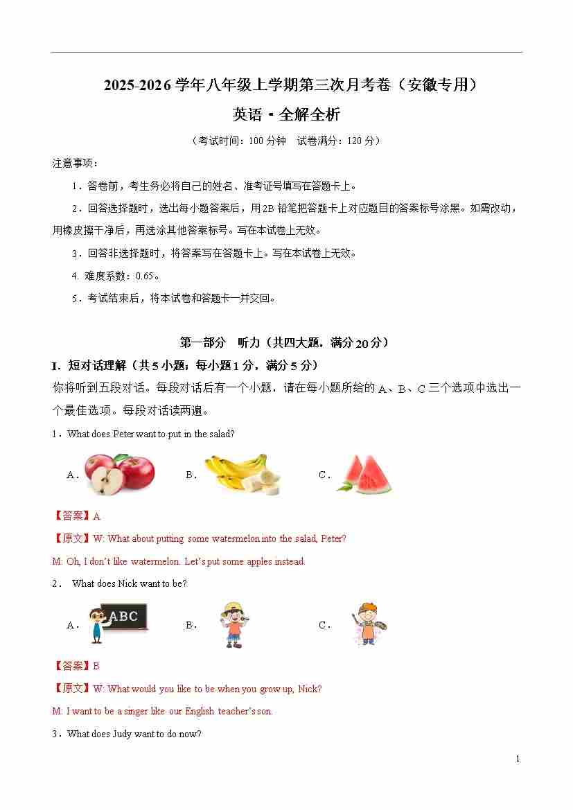八年级英语第三次月考卷(全解全析)(安徽专用)