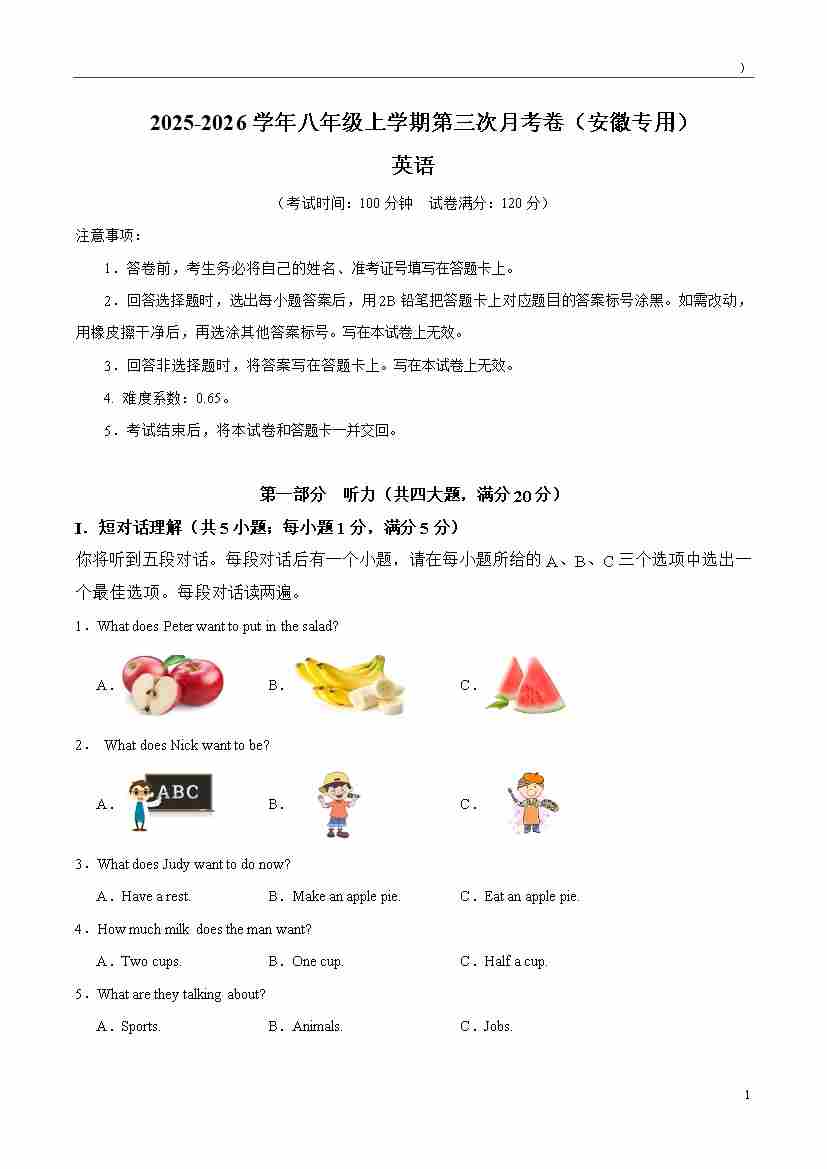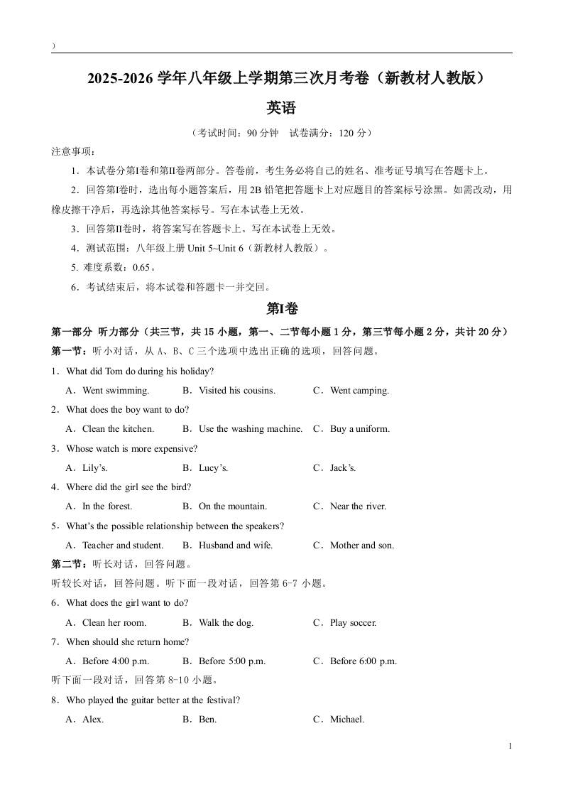 八年级英语第三次月考卷01(听力录音)(新教材人教版)