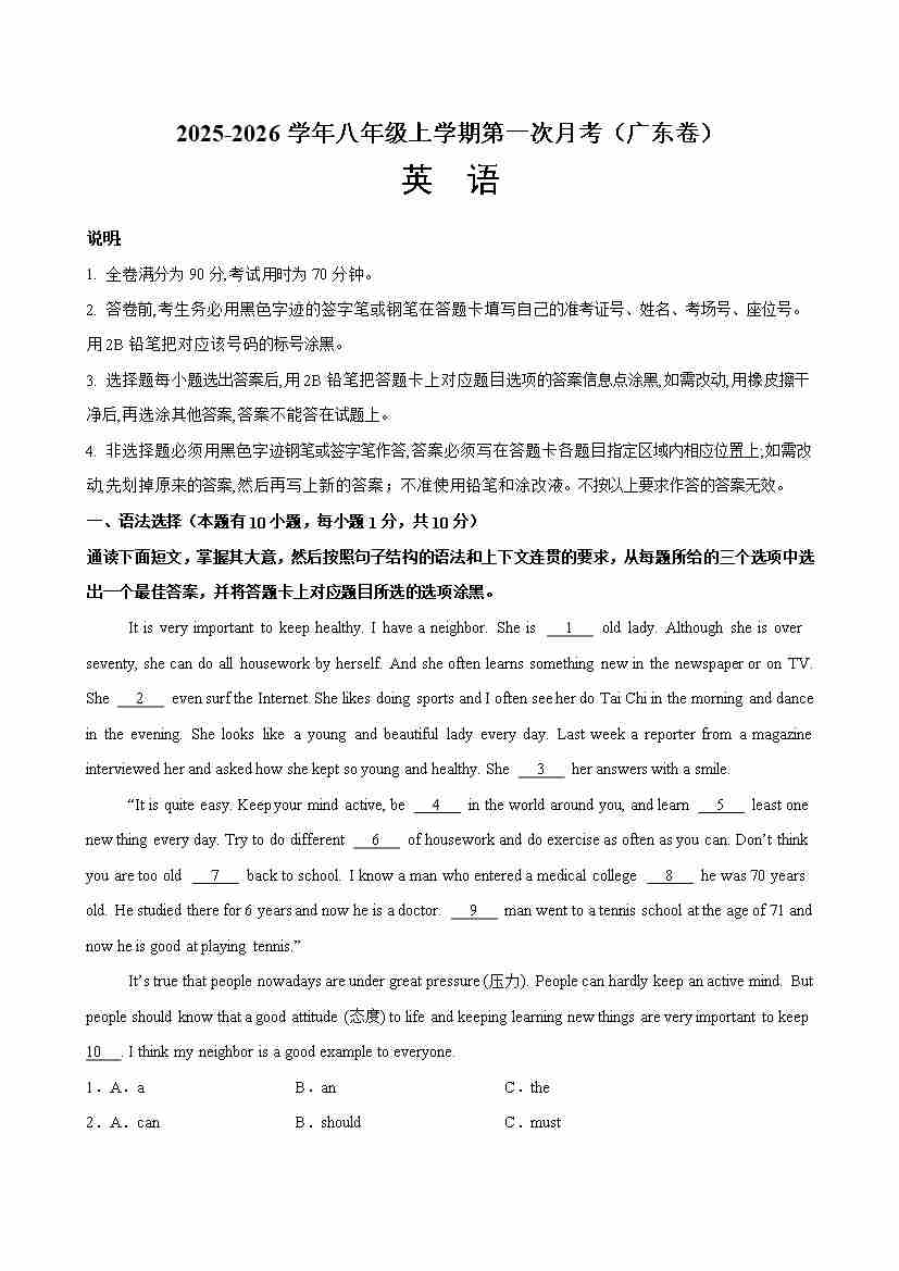 八年级英语上学期第一次月考(广东卷)(原卷版)