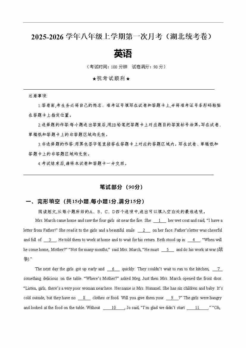 八年级英语上学期第一次月考(湖北卷)(原卷版)