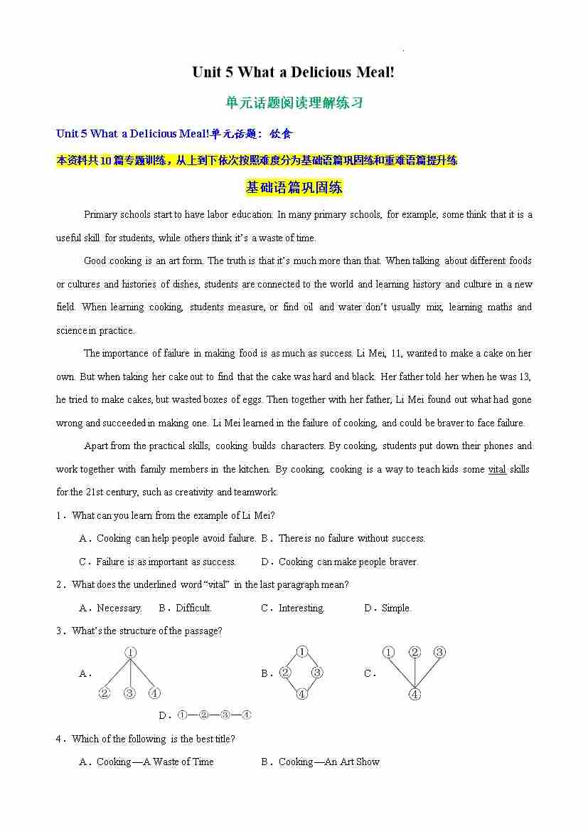 Unit 5 What a Delicious Meal! 单元话题阅读理解练习(原卷版)