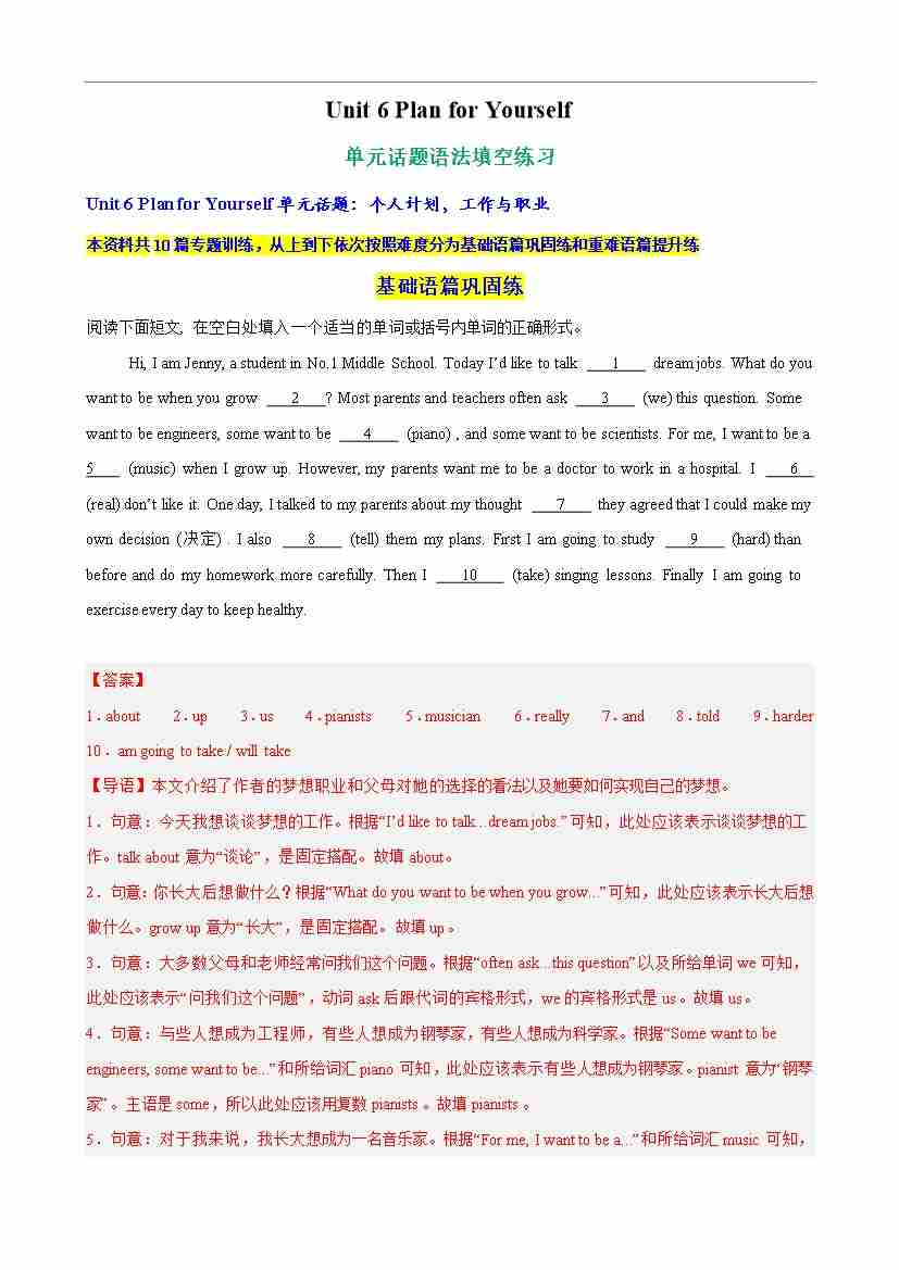 Unit 6 Plan for Yourself 单元话题语法填空练习(解析版)