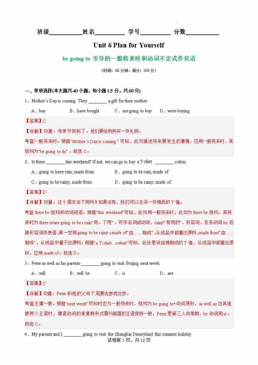 Unit 6 Plan for Yourself 语法Grammar be going to引导的一般将来时和动词不定式作宾语(解析版)