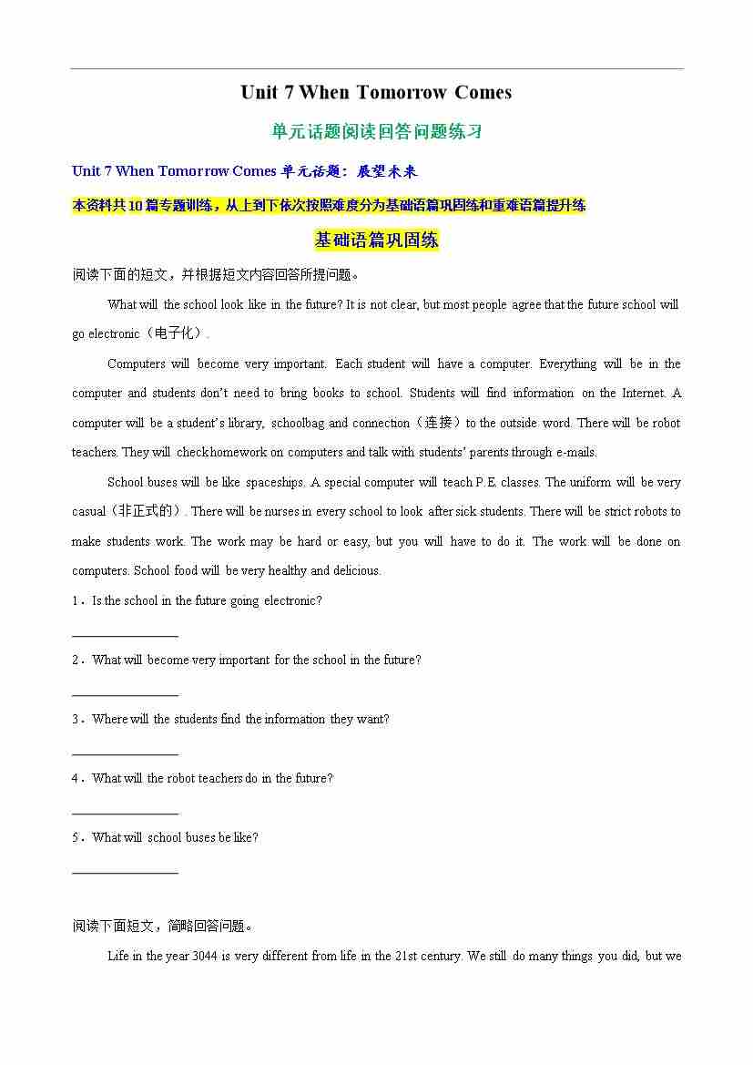 Unit 7 When Tomorrow Comes 单元话题阅读回答问题练习(原卷版)