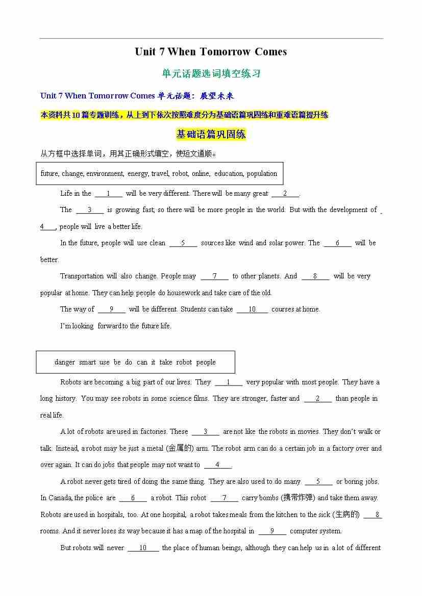 Unit 7 When Tomorrow Comes单元话题选词填空练习(原卷版)