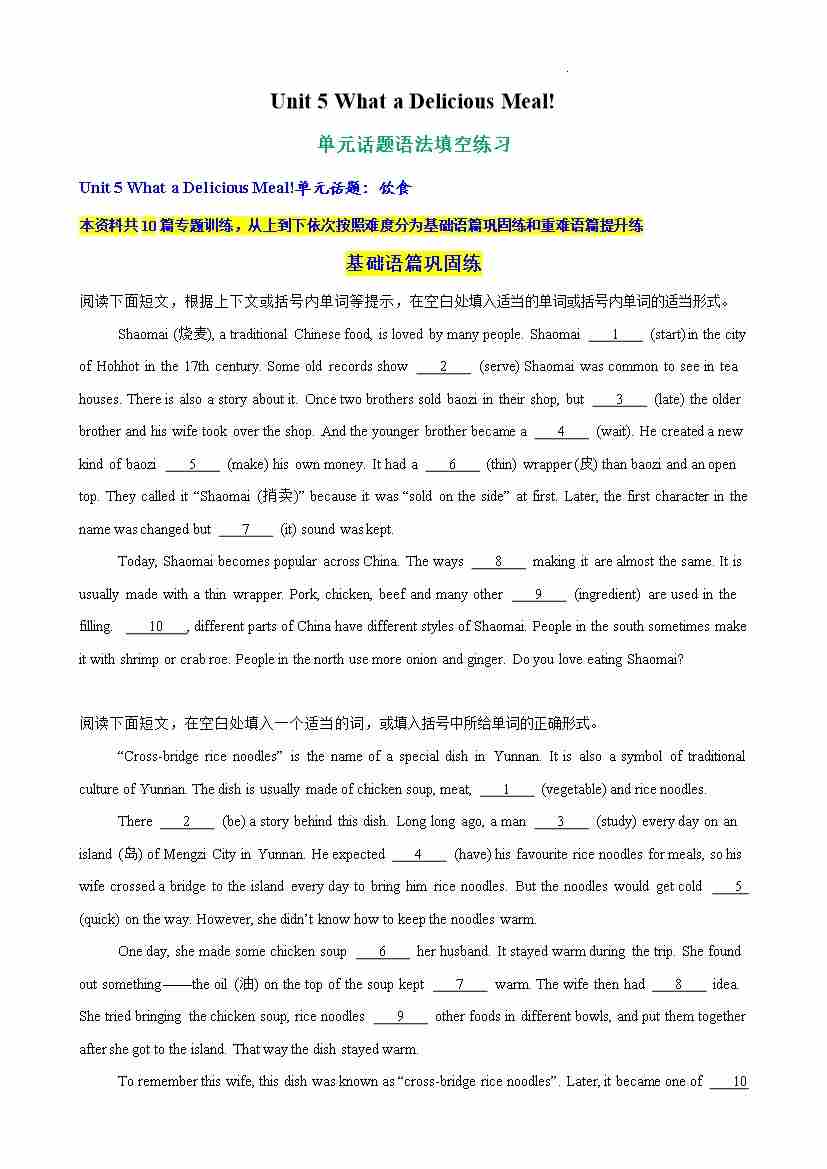 Unit 5 What a Delicious Meal! 单元话题语法填空练习(原卷版)