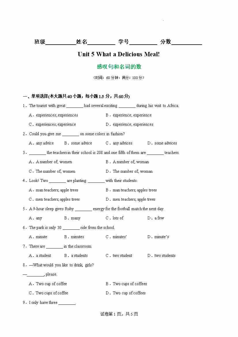 Unit 5 What a Delicious Meal! 语法Grammar 感叹句和名词的数(原卷版)