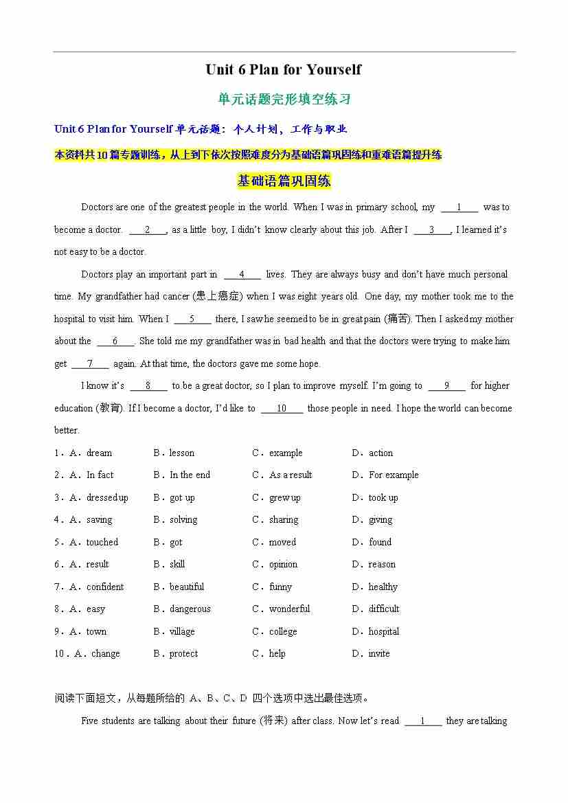 Unit 6 Plan for Yourself 单元话题完形填空练习(原卷版)