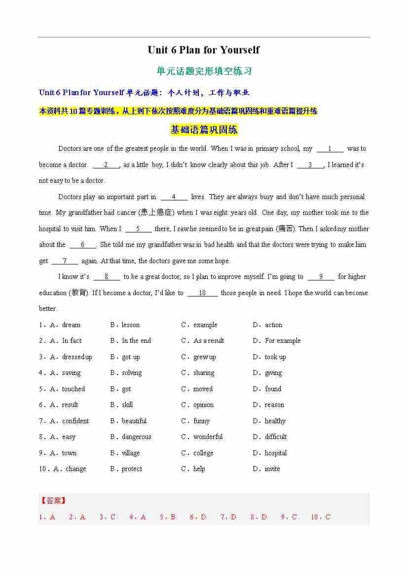 Unit 6 Plan for Yourself 单元话题完形填空练习(解析版)