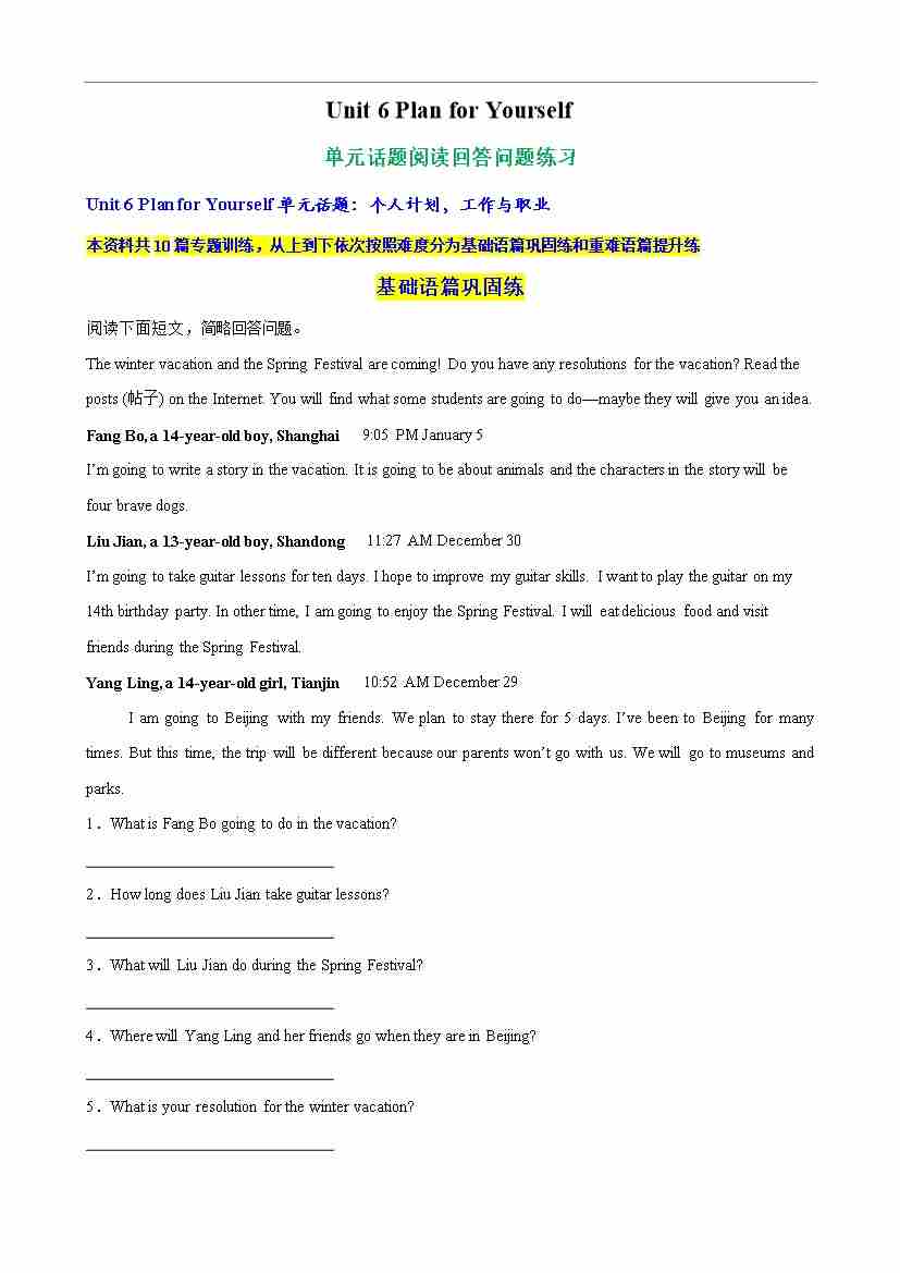 Unit 6 Plan for Yourself 单元话题阅读回答问题练习(解析版)