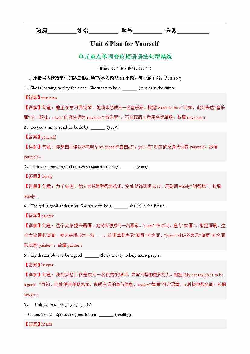 Unit 6 Plan for Yourself核心单词,词性转换,短语,语法,句型精练(解析版)