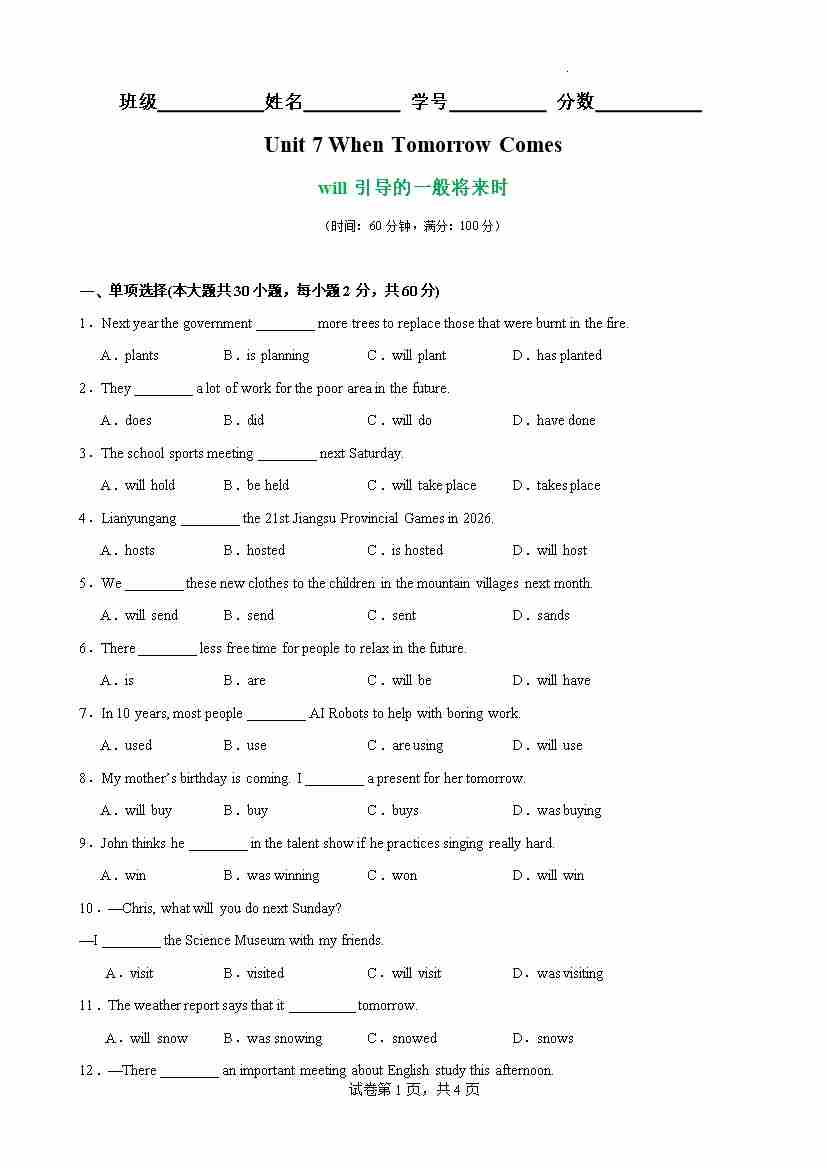Unit 7 When Tomorrow Comes 语法Grammar will引导的一般将来时(原卷版)