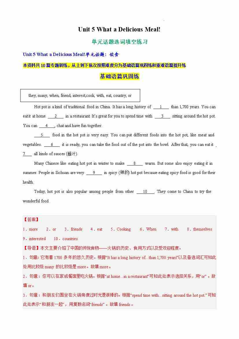 Unit 5 What a Delicious Meal! 单元话题完形填空练习(解析版)