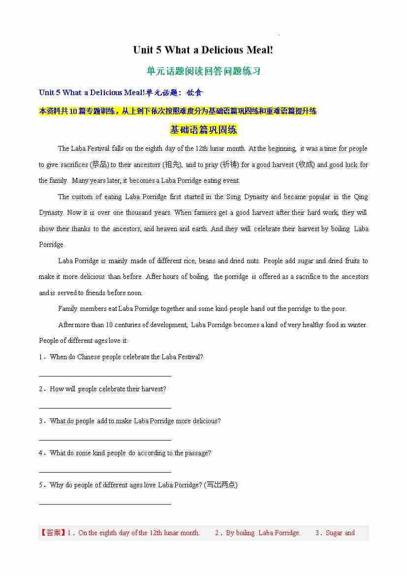 Unit 5 What a Delicious Meal! 单元话题阅读回答问题练习(解析版)