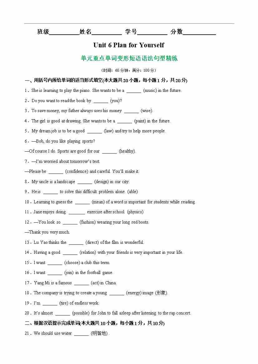 Unit 6 Plan for Yourself核心单词,词性转换,短语,语法,句型精练(原卷版)