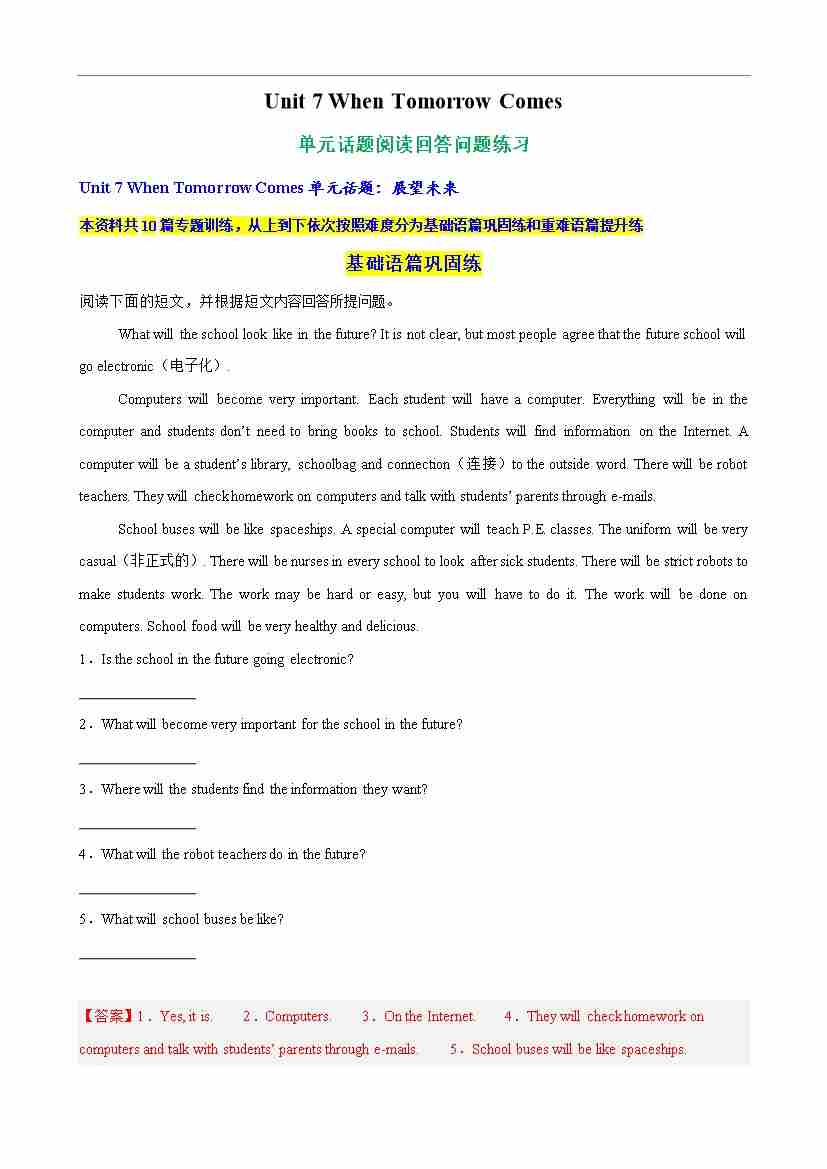 Unit 7 When Tomorrow Comes 单元话题阅读回答问题练习(解析版)