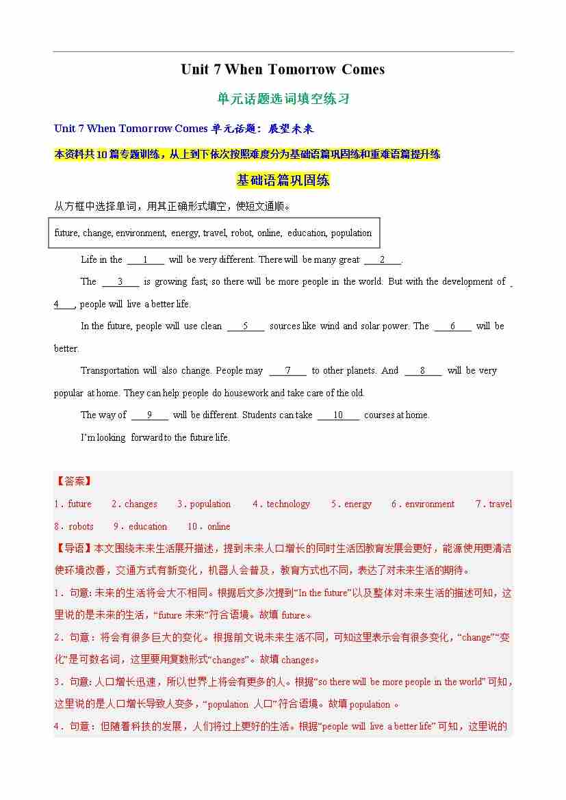 Unit 7 When Tomorrow Comes 单元话题语法填空练习(解析版)