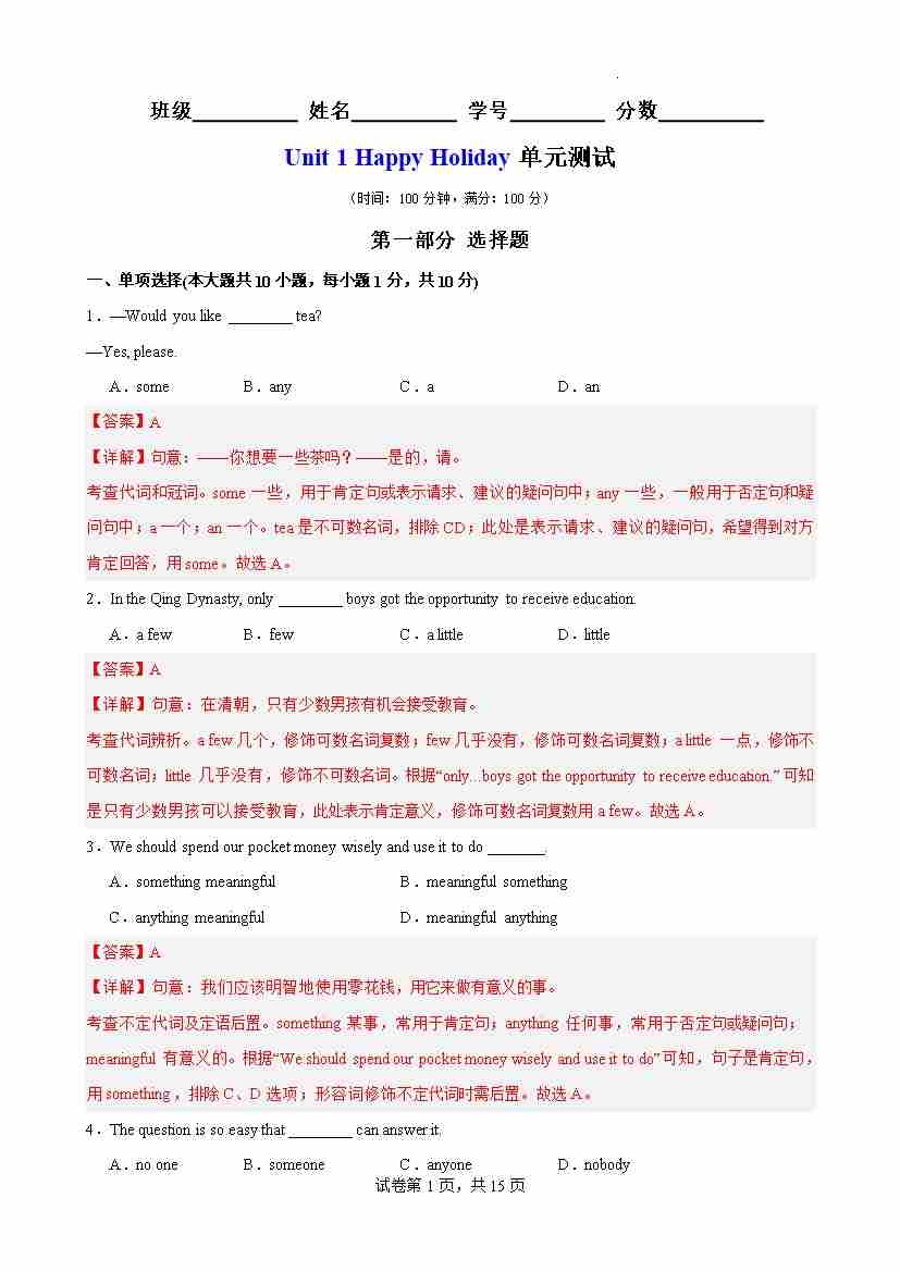 Unit 1 Happy Holiday 单元测试(解析版)