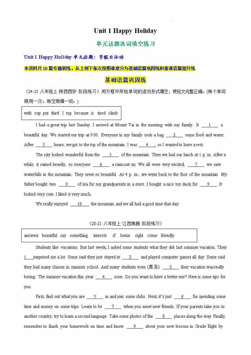Unit 1 Happy Holiday 单元话题选词填空练习(原卷版)