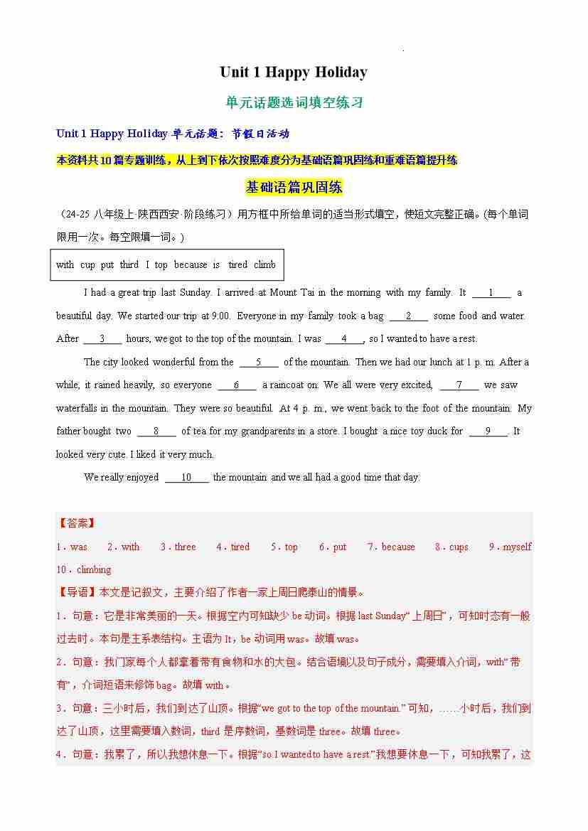Unit 1 Happy Holiday 单元话题完形填空练习(解析版)