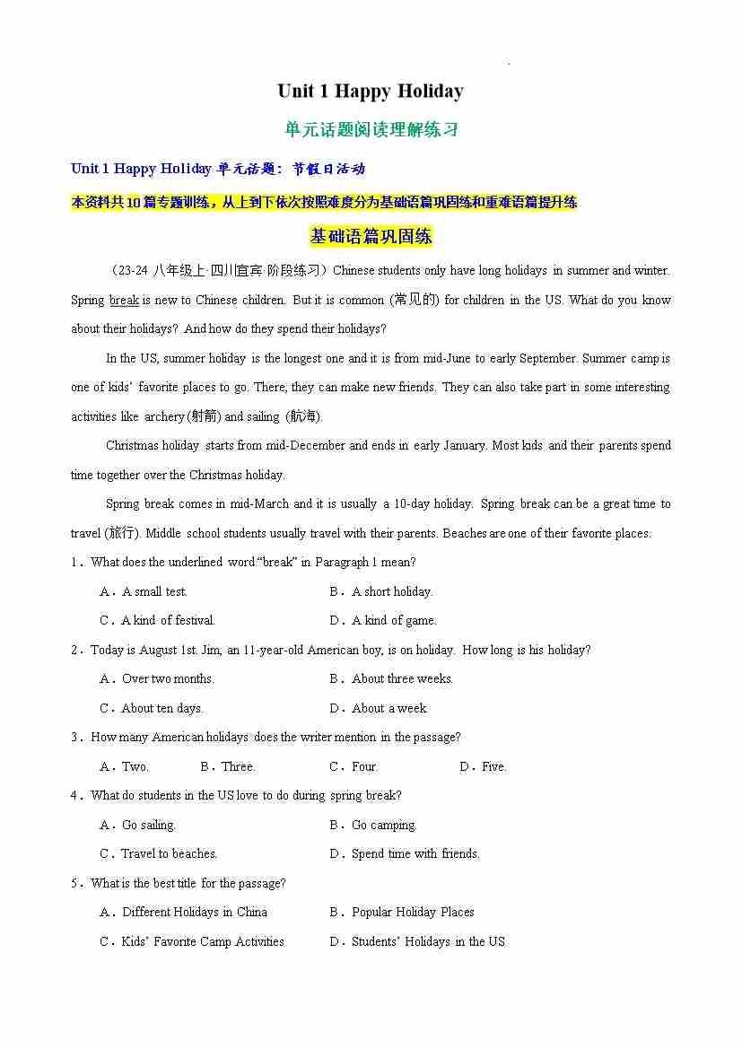 Unit 1 Happy Holiday 单元话题阅读理解练习(原卷版)