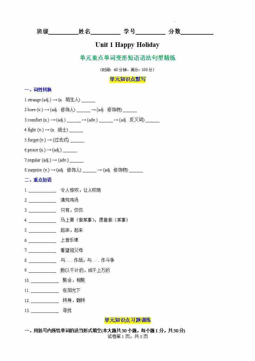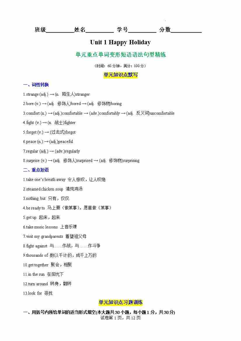 Unit 1 Happy Holiday单元重点单词词性转换短语语法句型精练(原卷版)