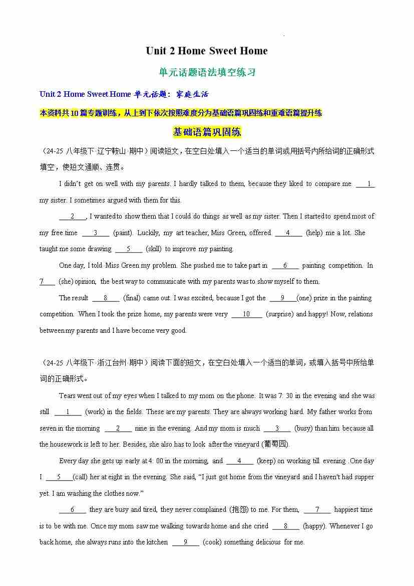 Unit 2 Home Sweet Home 单元话题语法填空练习(原卷版)