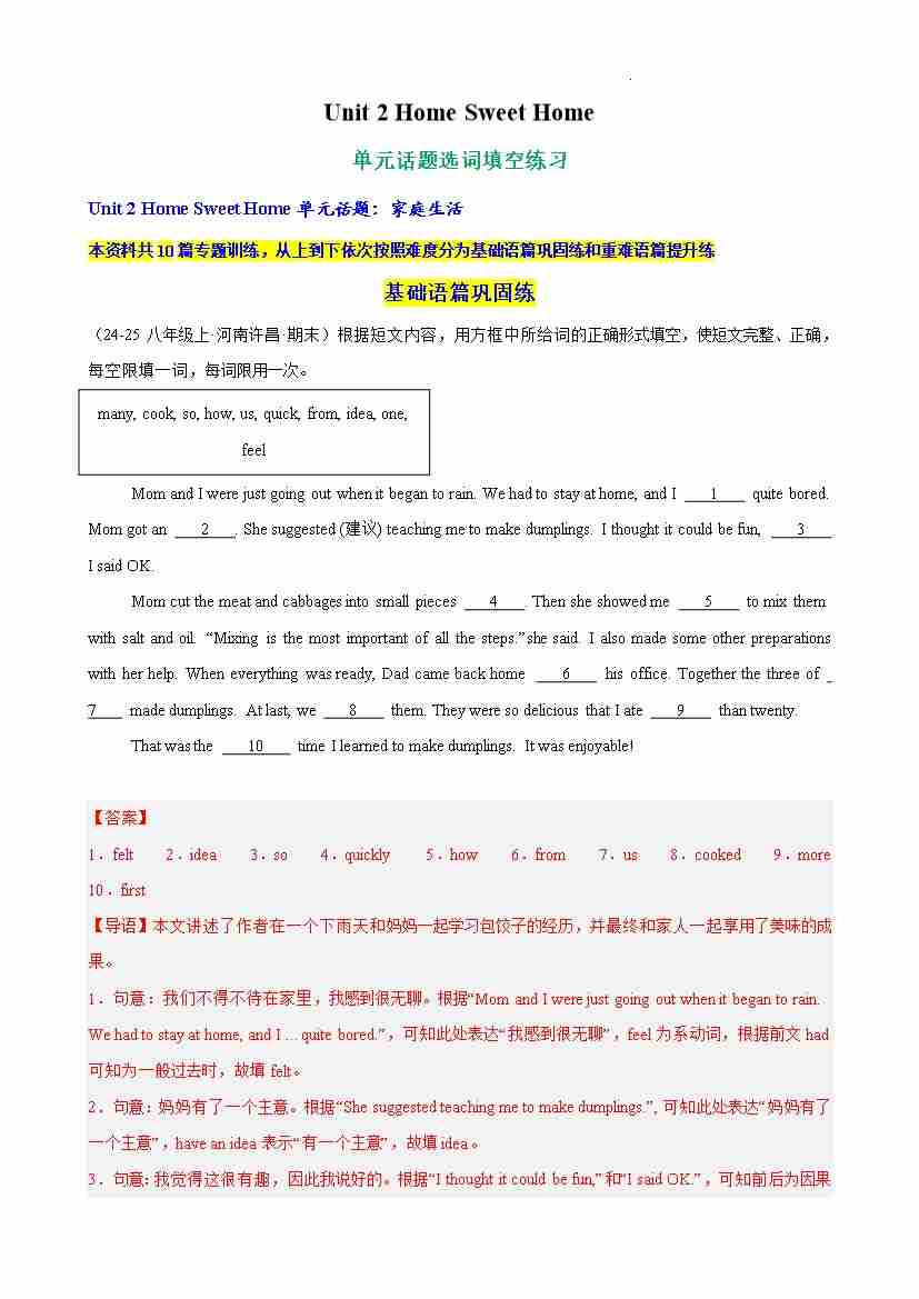 Unit 2 Home Sweet Home 单元话题选词填空练习(解析版)