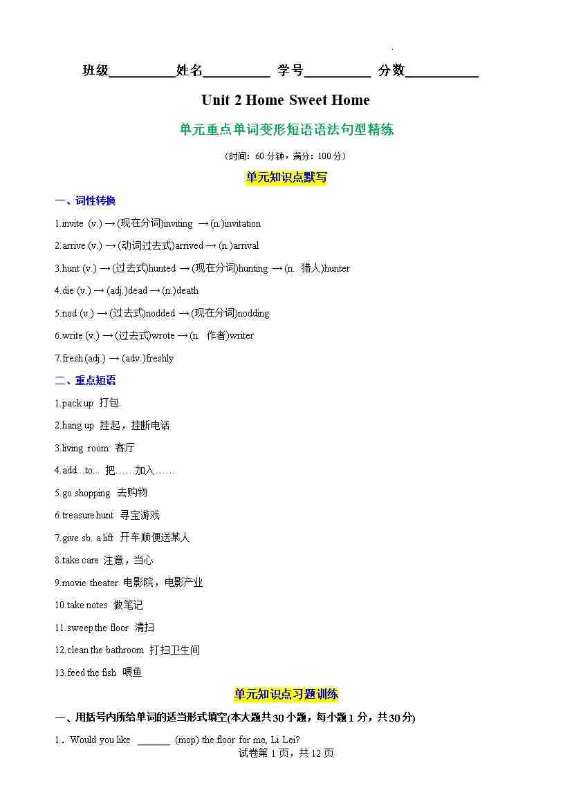 Unit 2 Home Sweet Home 单元重点单词词性转换短语语法句型精练(解析版)