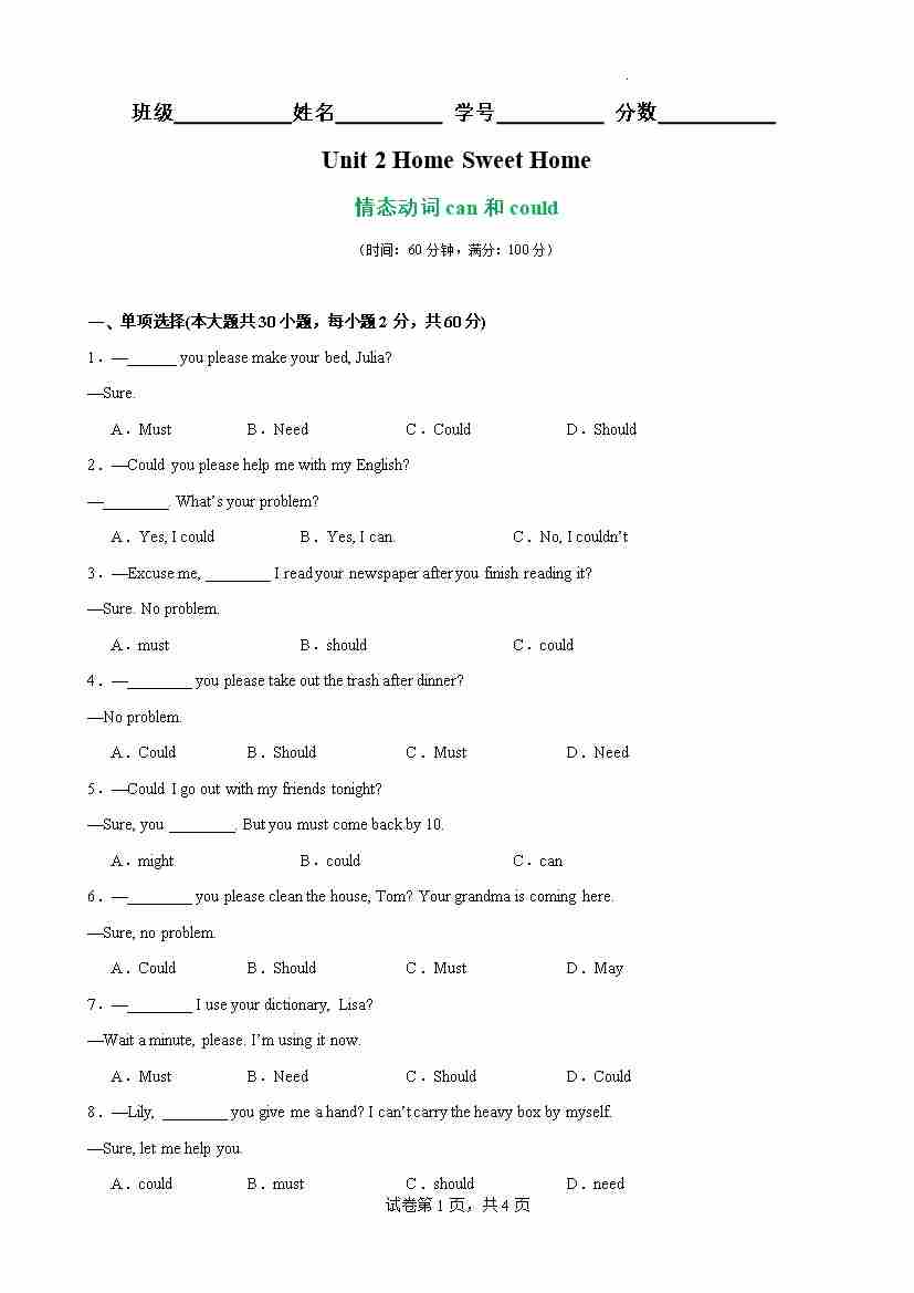 Unit 2 Home Sweet Home 语法Grammar 情态动词can和could(原卷版)