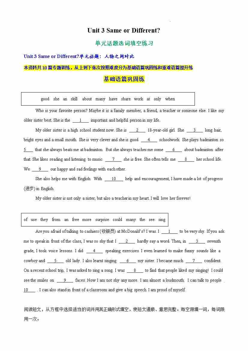 Unit 3 Same or Different 单元话题选词填空练习(原卷版)