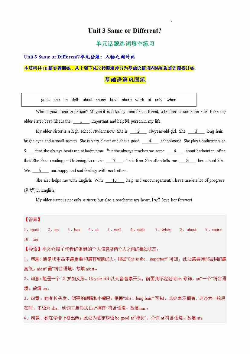 Unit 3 Same or Different 单元话题选词填空练习(解析版)