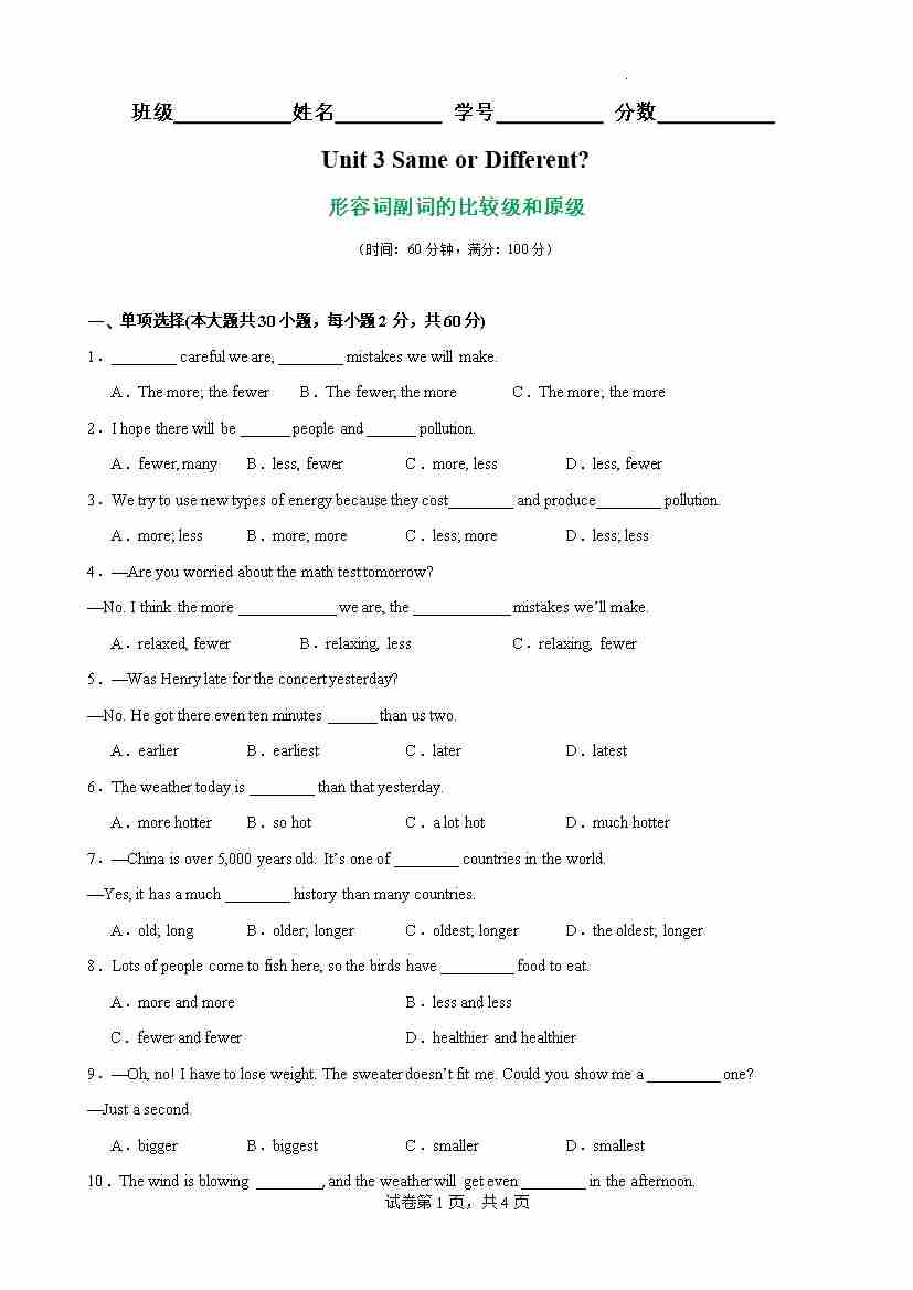 Unit 3 Same or Different 语法Grammar 形容词副词的比较级和原级(原卷版)