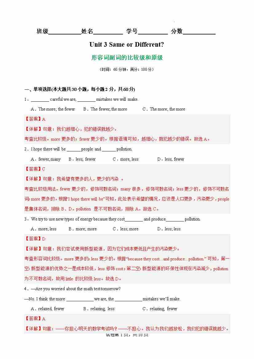 Unit 3 Same or Different 语法Grammar 形容词副词的比较级和原级(解析版)