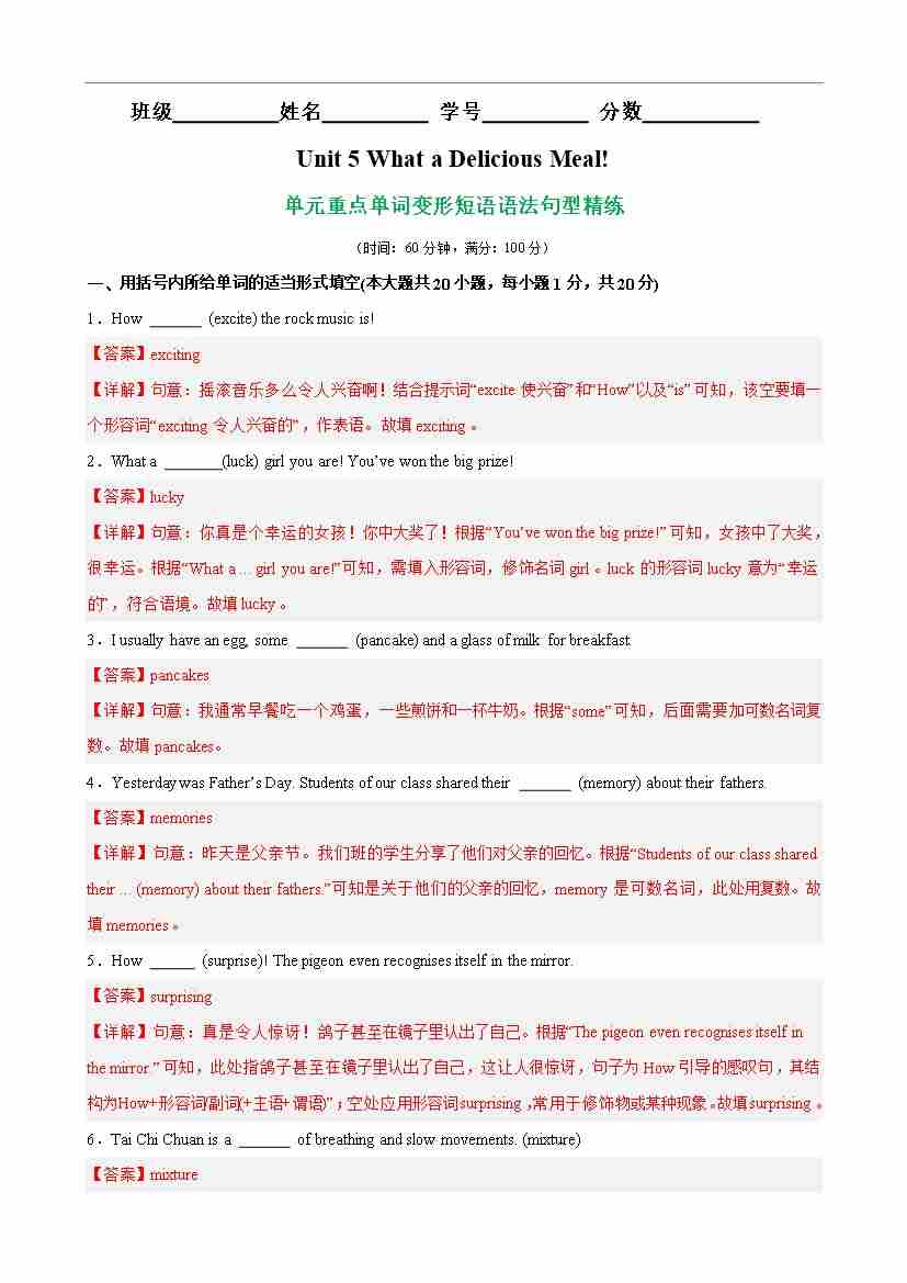 Unit 5 What a Delicious Meal!核心单词,词性转换,短语,语法,句型精练(解析版)