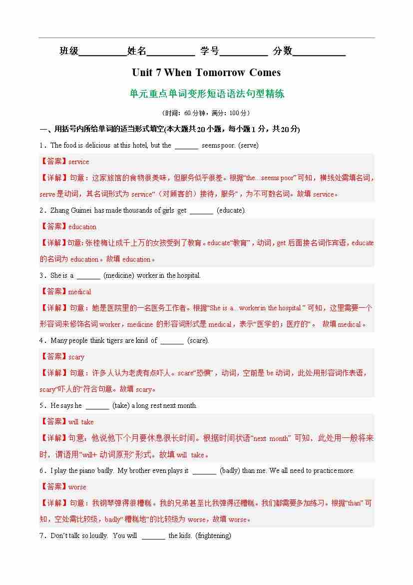 Unit 7 When Tomorrow Comes核心单词,词性转换,短语,语法,句型精练(解析版)