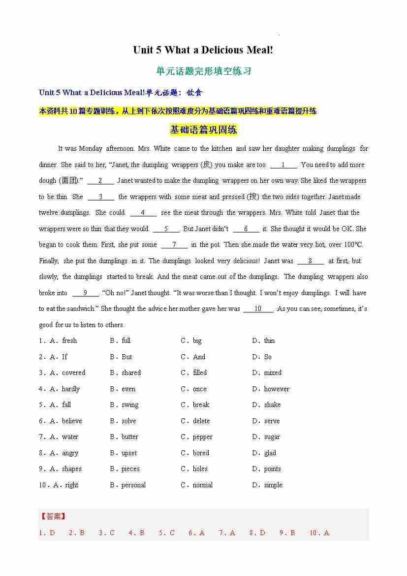 Unit 5 What a Delicious Meal! 单元话题完形填空练习(解析版)
