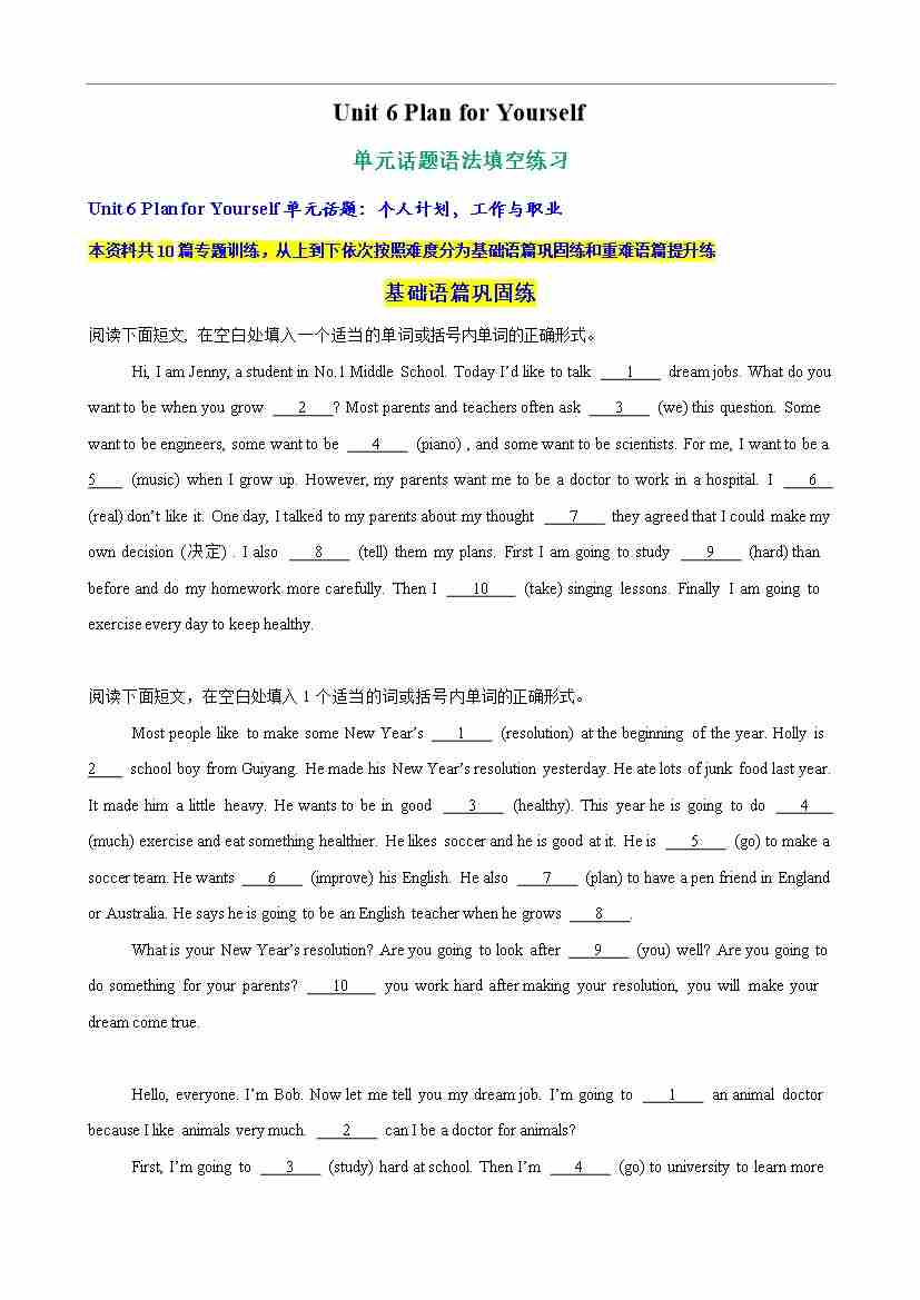 Unit 6 Plan for Yourself 单元话题语法填空练习(原卷版)