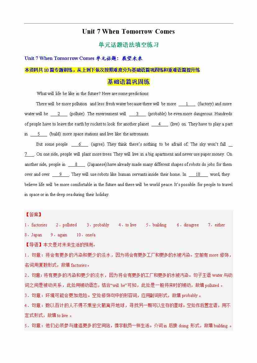 Unit 7 When Tomorrow Comes 单元话题语法填空练习(解析版)